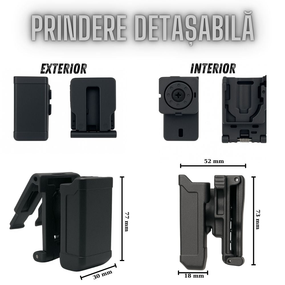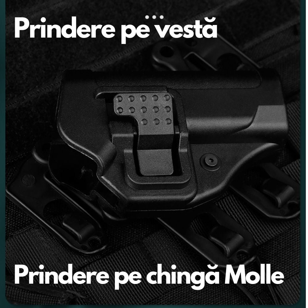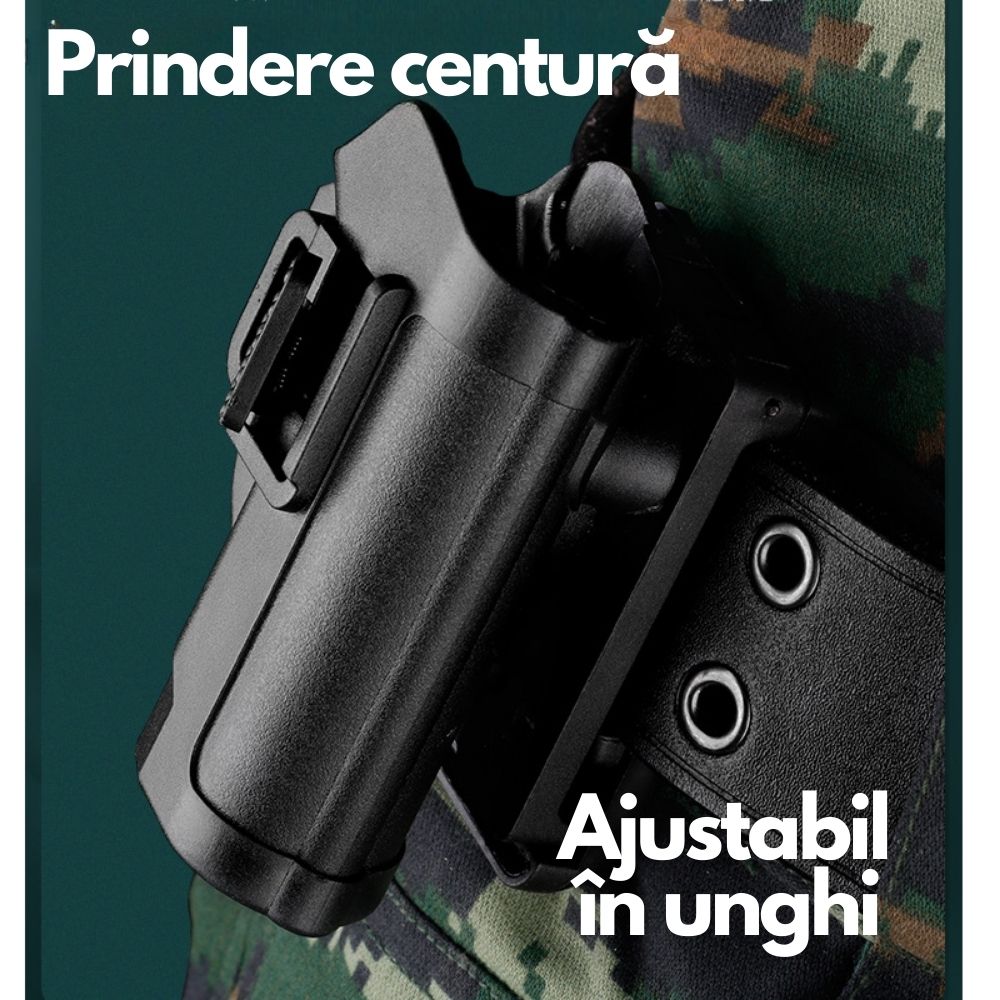 Holsterul special creat pentru pistolul CARPATI adauga un nivel superior de functionalitate si eficienta in gestionarea armamentului. Echipat cu un sistem rapid de introducere si scoatere a pistolului, precum si cu un mecanism de blocare cu eliberare rapida, acest holster este conceput sa ofere un acces sigur si rapid la pistolul CARPATI, asigurand in acelasi timp securitatea maxima.