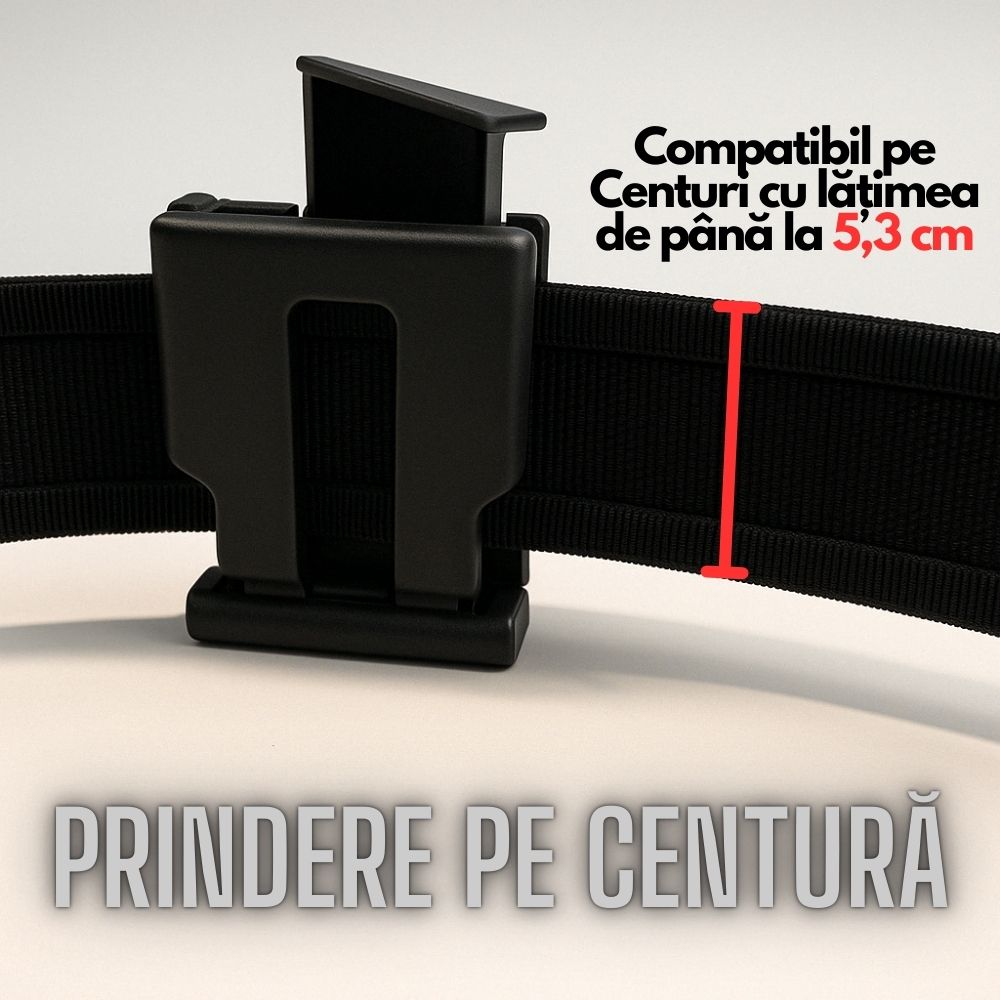 Sistemul de prindere pe centura ofera o modalitate personalizabila de transport. Inaltimea si unghiul acestui sistem pot fi adaptate in functie de preferinte individuale, asigurand o potrivire perfecta pentru utilizator. Mai mult, se potriveste cu centuri de latimi variate, inclusiv cele de pana la 60 mm. Aceasta flexibilitate permite utilizatorilor sa ajusteze setul la echipamentul si imbracamintea lor curenta.