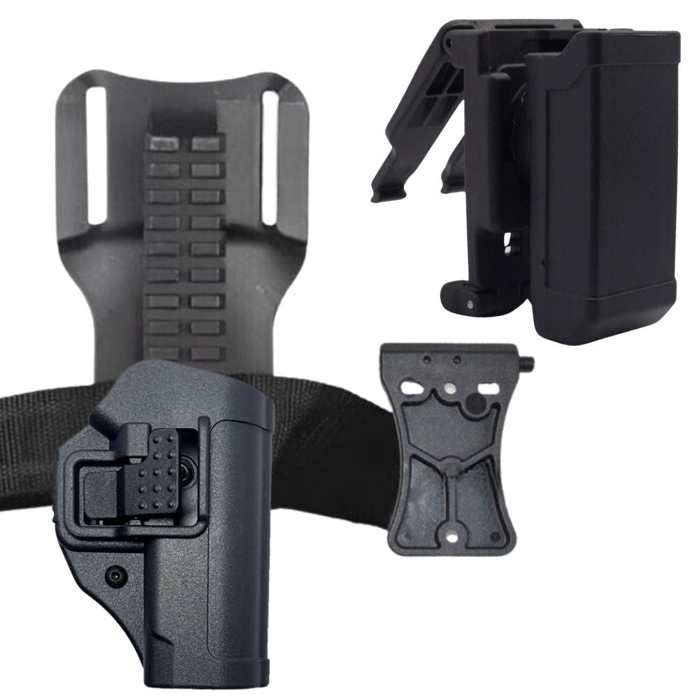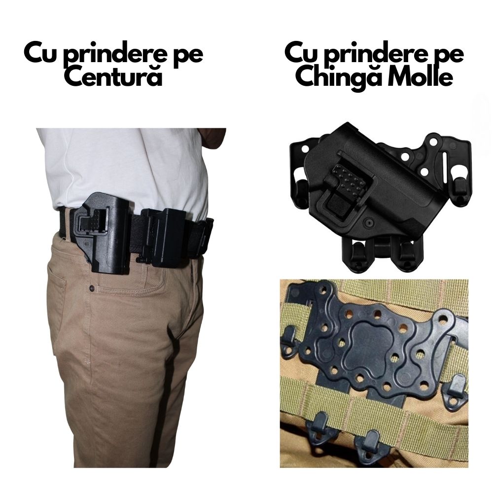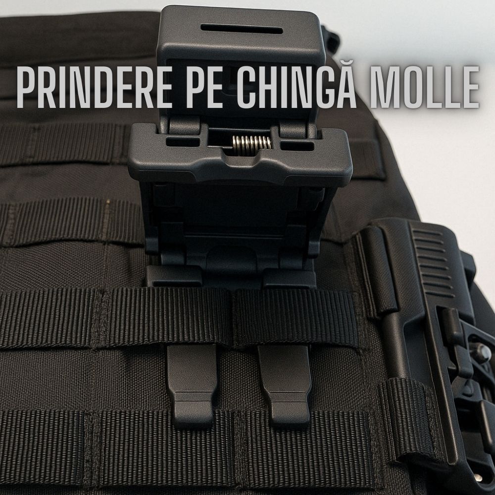 Sistemul de prindere pe chinga Molle adauga un nivel suplimentar de versatilitate. Prin intermediul acestui sistem, utilizatorii pot ajusta pozitia tocului in diferite moduri pentru a corespunde nevoilor lor specifice. Compatibilitatea cu majoritatea tocurilor tip holster asigura ca acest set poate fi integrat cu usurinta in echipamentul existent, fara a necesita schimbari majore.